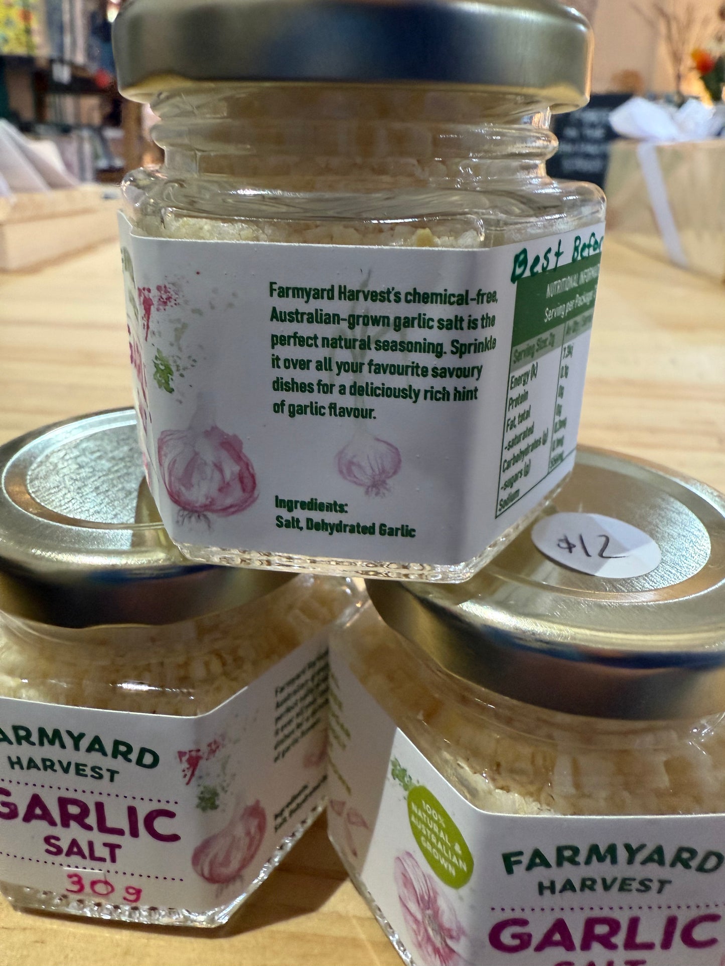 Garlic Salt, made with garlic grown by Farmyard Harvest and dried, blended with quality salts and packaged in glass jars.